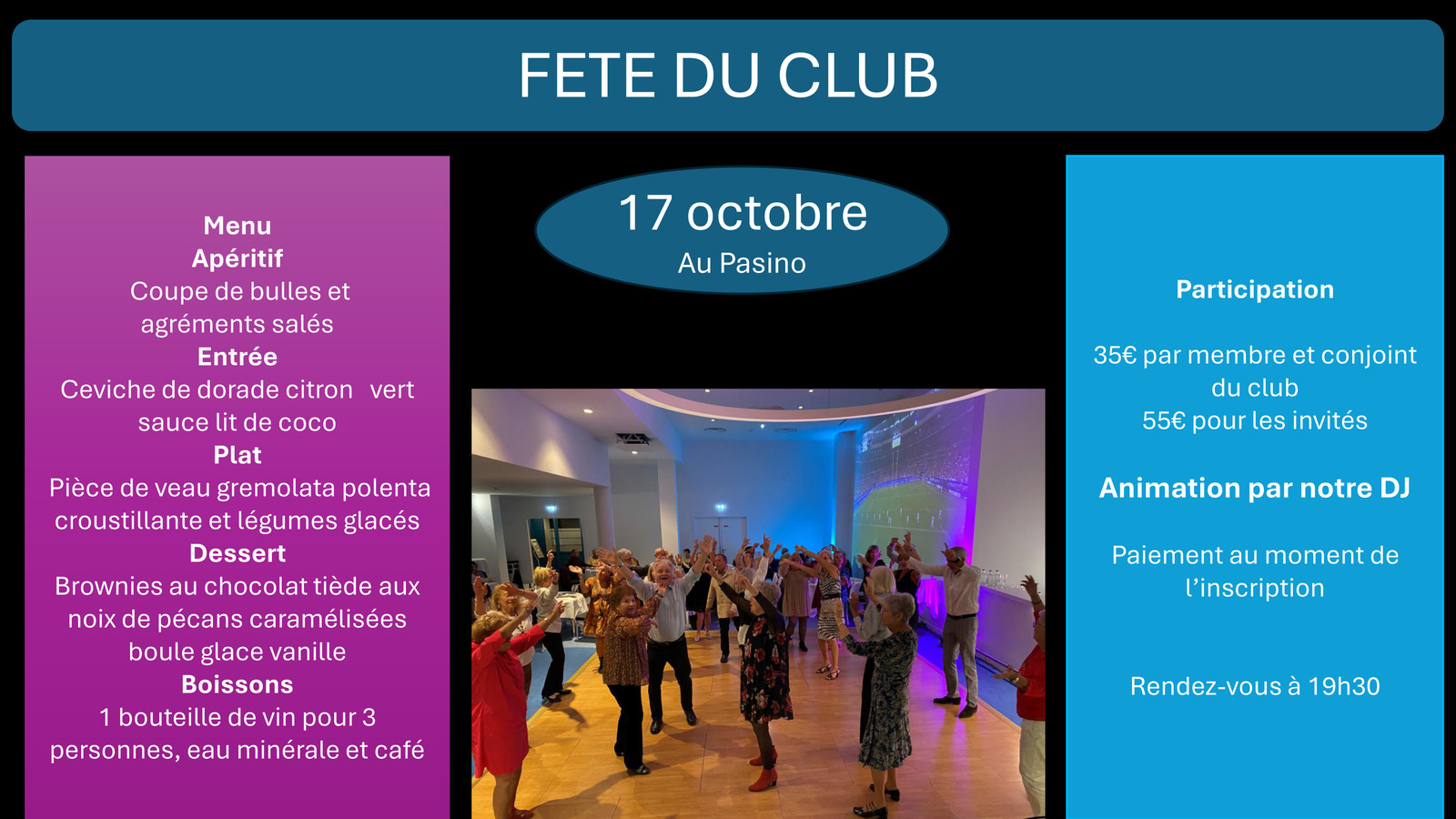 Notre Fête du Club aura lieu le vendredi 17 octobre 2025 au Pasino de Hyères, 1 avenue Ambroise Thomas, à 19H30.